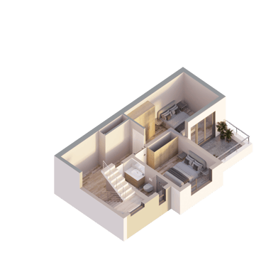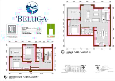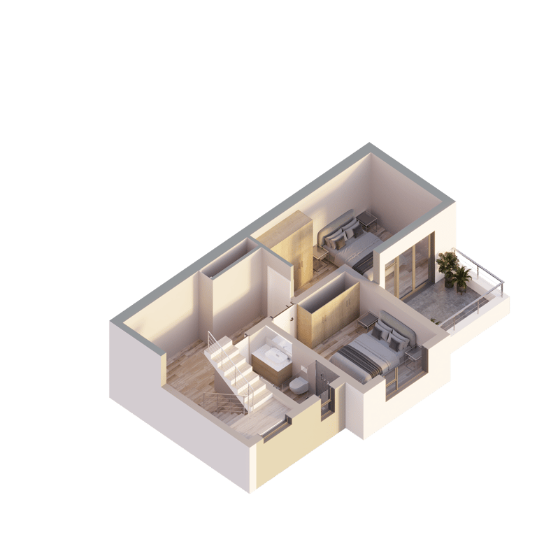 The upper level has been thoughtfully designed to provide privacy and comfort, featuring two well-appointed bedrooms with ample built-in storage and access to a shared balcony. A modern bathroom with quality finishes complements the layout, while the landing and passage area maintain the airy, uncluttered feel of the home. Clean architectural lines, warm textures, and carefully selected materials come together to create a stylish and tranquil interior environment.