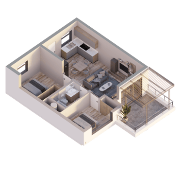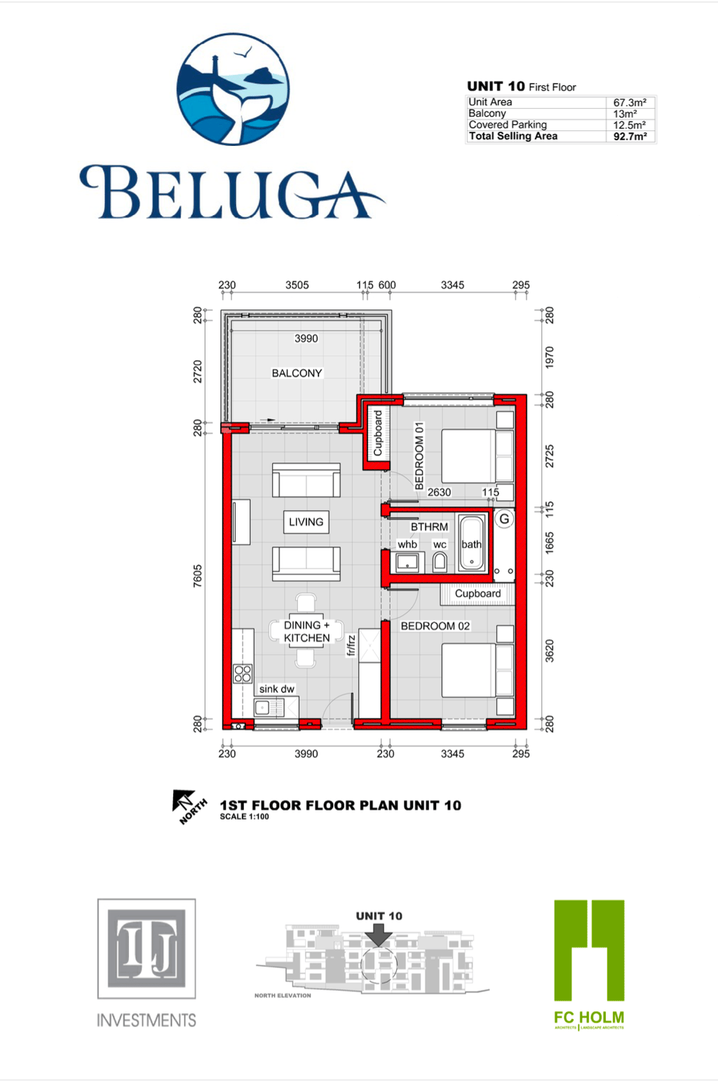 Unit 10 offers a bright, modern first-floor layout designed for comfortable and efficient living. The open-plan dining, kitchen and living area provides a spacious central hub, ideal for both everyday use and entertaining. Large sliding doors lead to a generous 13 m² balcony, bringing in abundant natural light and creating a seamless indoor–outdoor flow. The unit includes two well-sized bedrooms, each with built-in cupboards, along with a full bathroom featuring a bath, shower, WC and basin. With a total selling area of 92.7 m², including covered parking, Unit 10 delivers a contemporary, low-maintenance lifestyle with a well-organised and inviting floorplan.