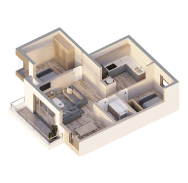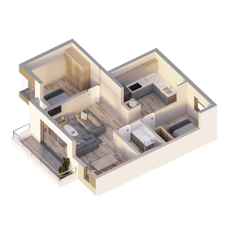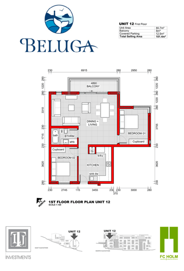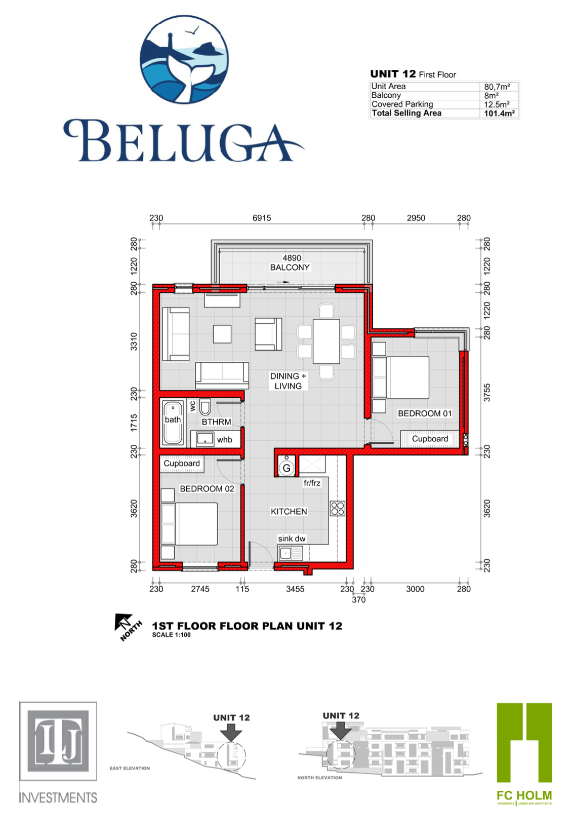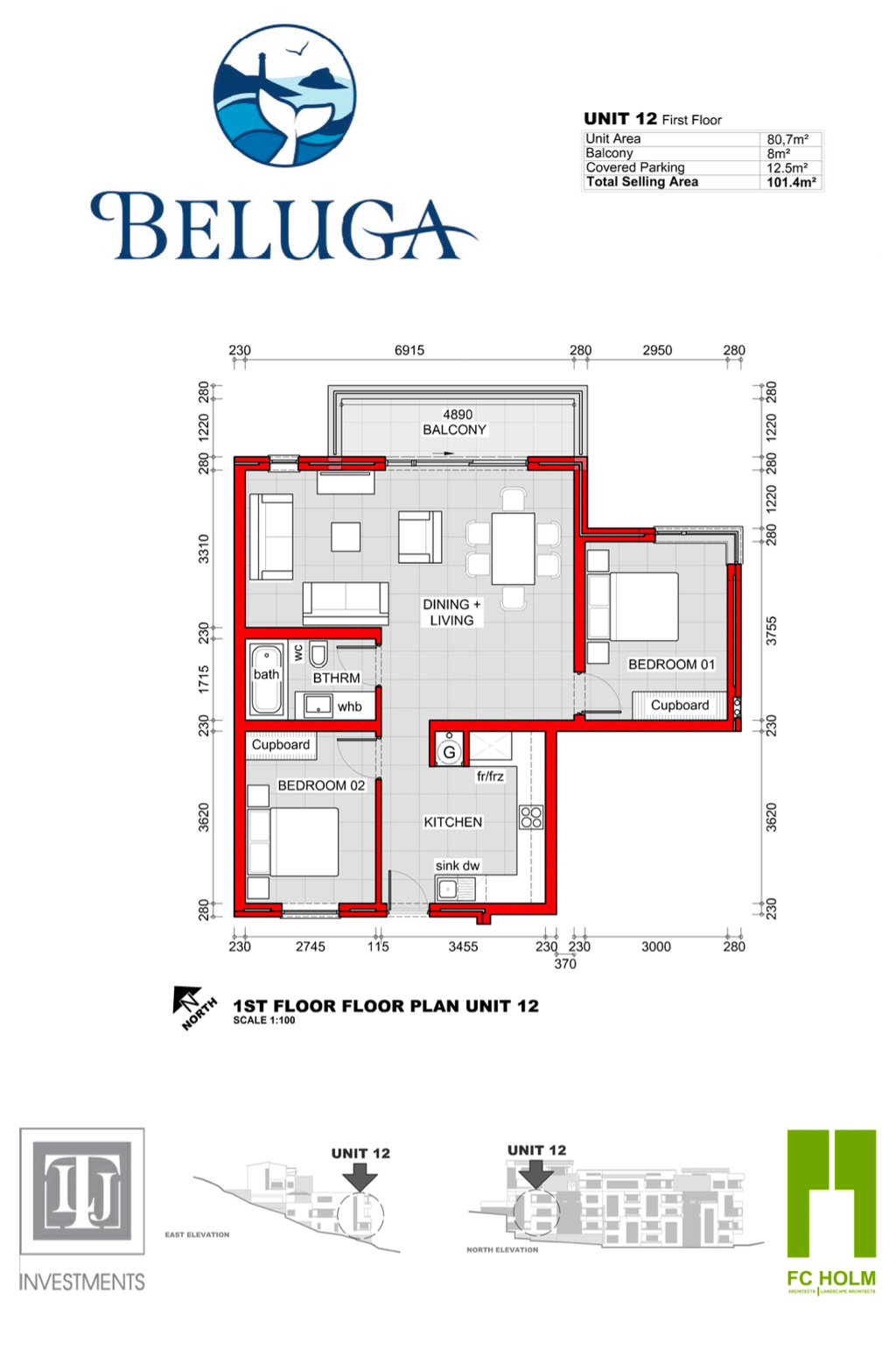 Unit 12 offers a spacious, well-designed first-floor layout that blends comfort with contemporary living. The open-plan dining and living area forms a generous central space, ideal for both daily use and entertaining. Large sliding doors open onto an 8 m² balcony, creating a bright and airy environment with a seamless indoor–outdoor flow. The home features two well-proportioned bedrooms, each fitted with built-in cupboards, and a full bathroom equipped with a bath, WC and basin. The separate kitchen offers practicality and efficient workspace, maintaining a smooth connection to the living area. With a total selling area of 101.4 m², including covered parking, Unit 12 provides a modern, comfortable and well-balanced living experience.