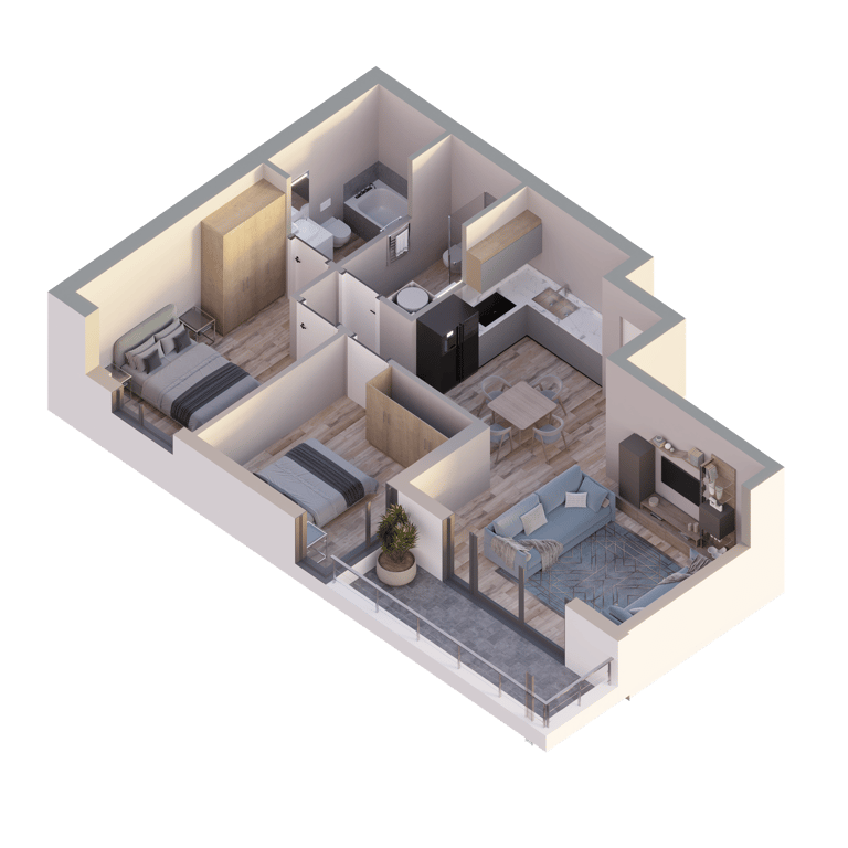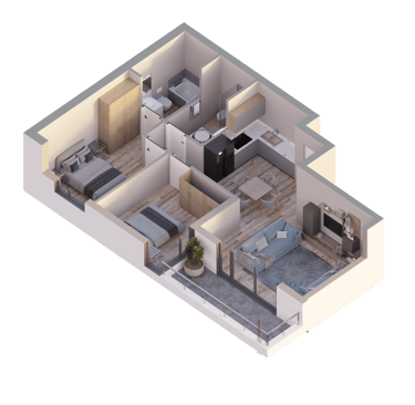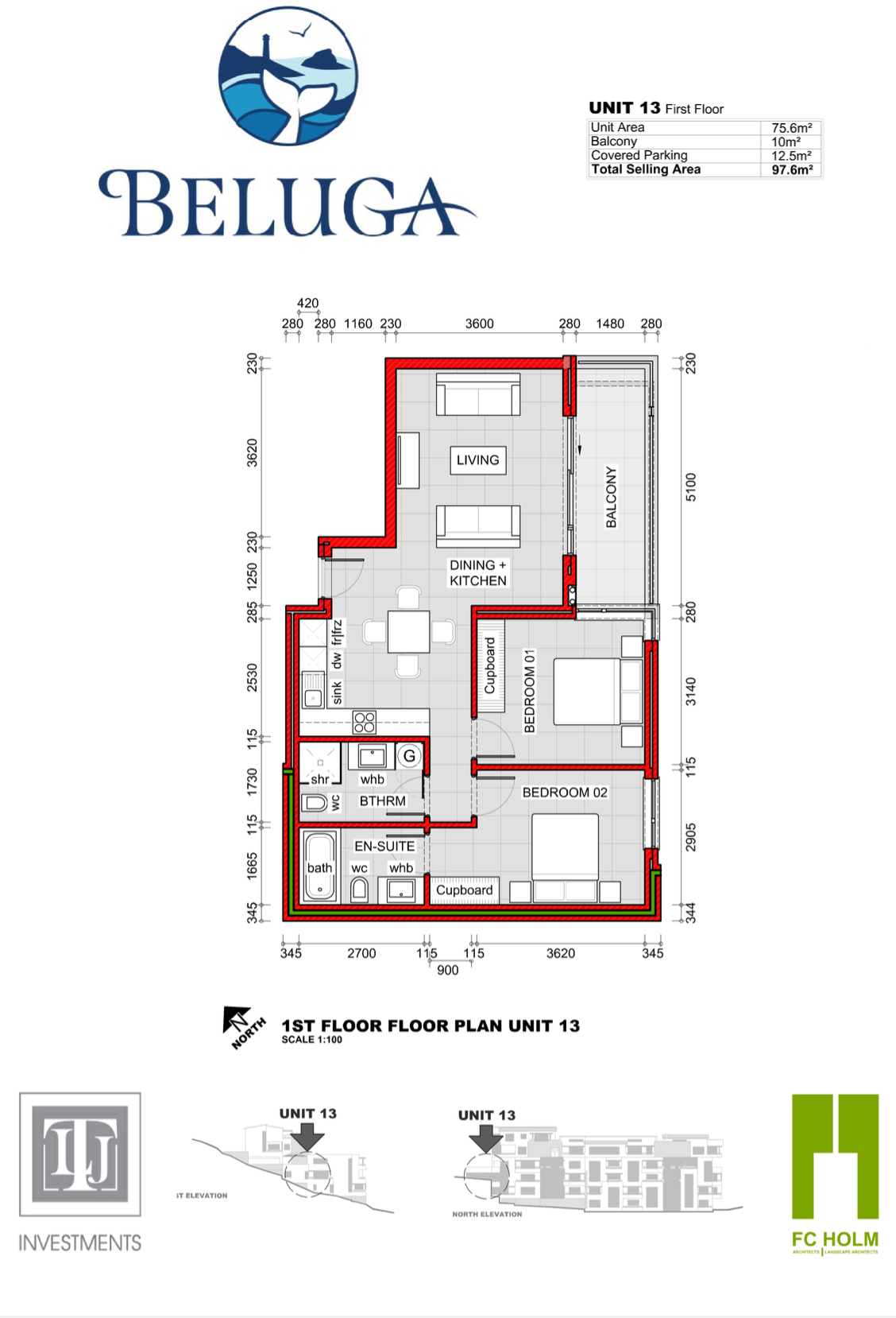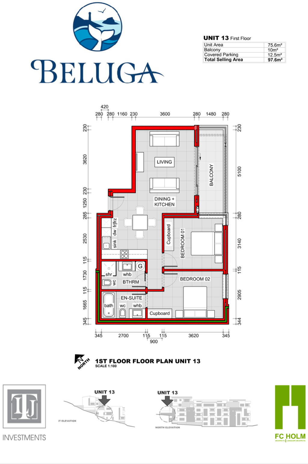 Unit 13 offers a well-proportioned and contemporary first-floor layout, designed for both comfort and functionality. The open-plan dining, kitchen and living area forms a welcoming central space, enhanced by sliding doors that open onto a generous 10 m² balcony—ideal for fresh air, natural light and relaxed outdoor living. The unit includes two bedrooms, both fitted with built-in cupboards. The main bedroom features a private en-suite bathroom with a bath, WC and basin, while a second bathroom with a shower, WC and basin conveniently serves the rest of the home. With a total selling area of 97.6 m², including covered parking, Unit 13 provides a modern and efficient living environment with excellent flow throughout.