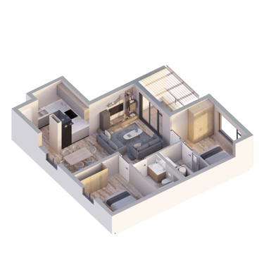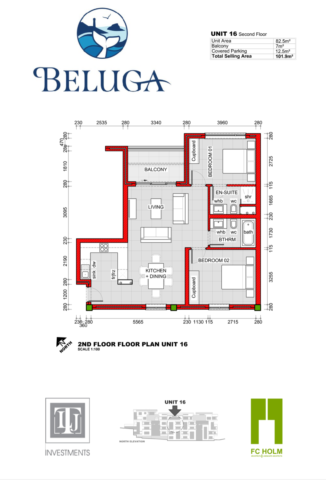 Unit 16 offers a modern and well-designed second-floor layout with excellent flow and natural light throughout. The spacious open-plan kitchen, dining and living area forms the heart of the home, opening onto a 7 m² balcony that creates a bright and airy extension of the living space. The unit includes two generously sized bedrooms, each fitted with built-in cupboards. The main bedroom features a private en-suite bathroom with a shower, WC and basin, while a second full bathroom—complete with bath, WC and basin—serves the remainder of the home. With a total selling area of 101.9 m², including covered parking, Unit 16 delivers a contemporary, comfortable and highly functional living experience.