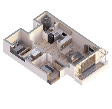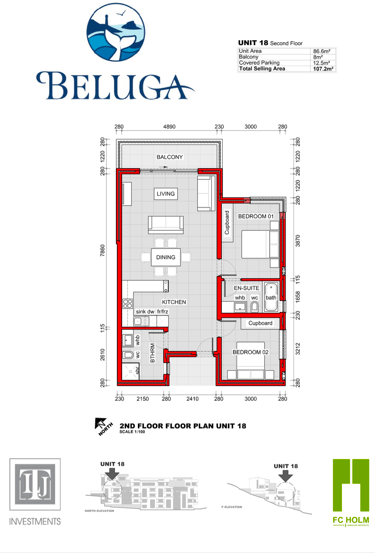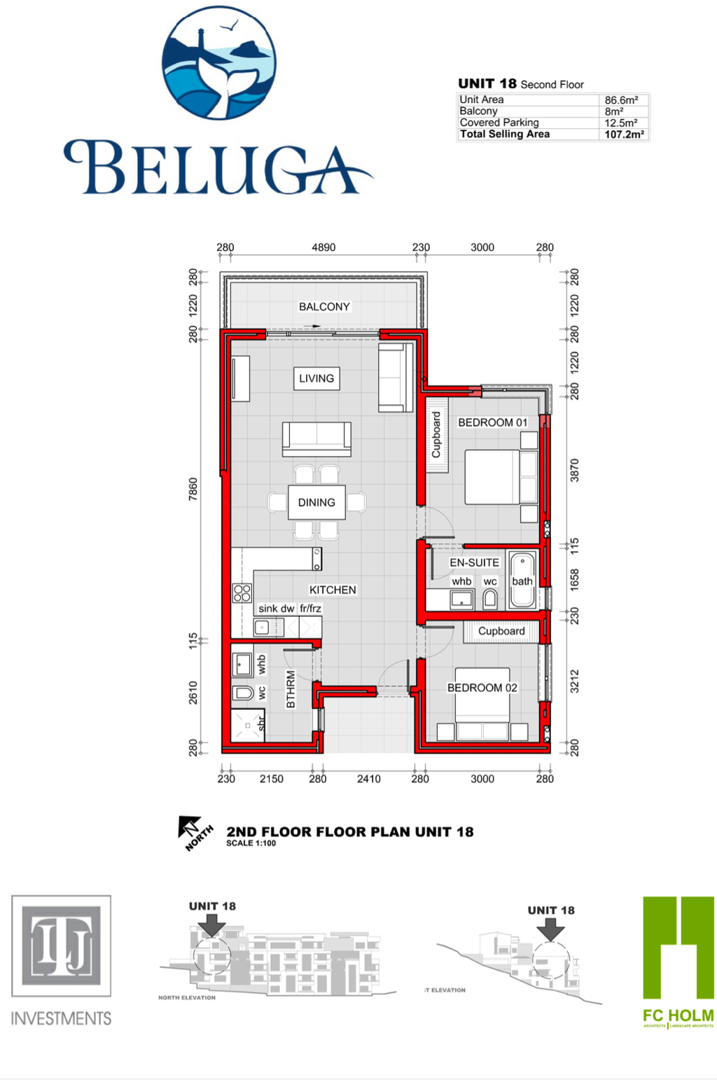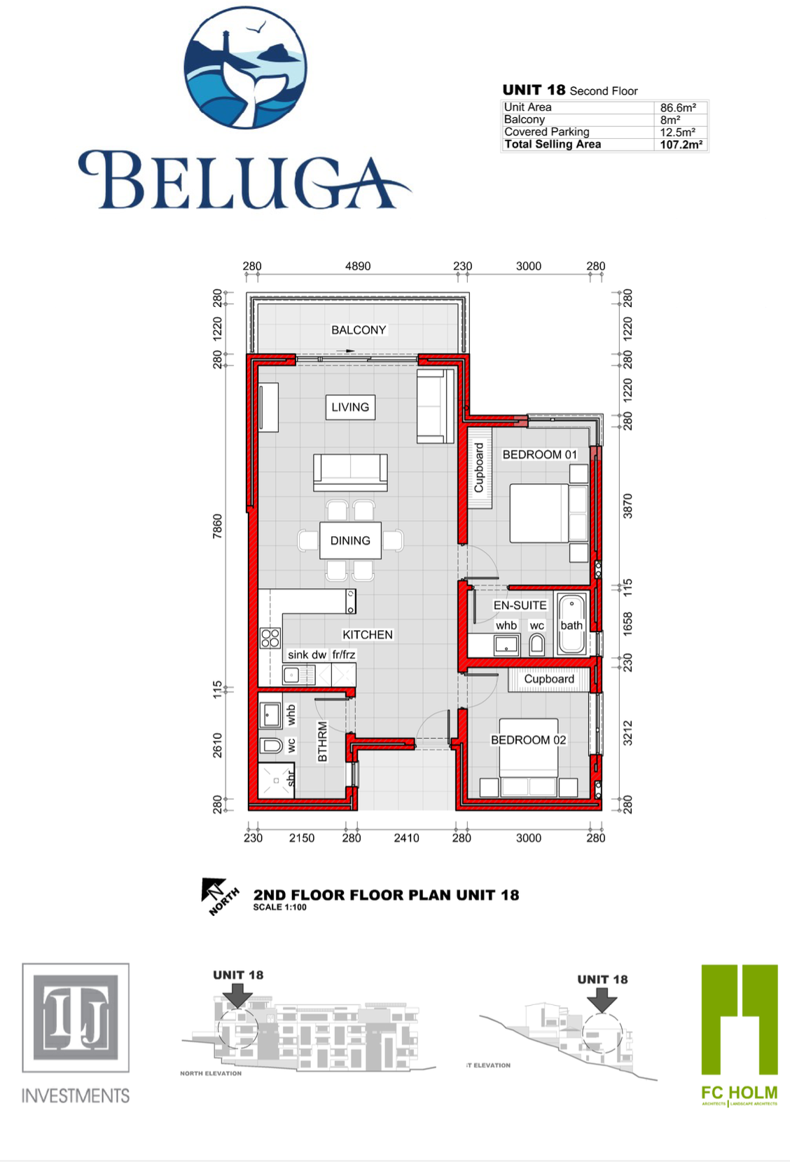 Unit 18 presents a spacious and modern second-floor layout with a strong emphasis on open-plan living and natural light. The large combined kitchen, dining and living area creates an inviting central hub, flowing seamlessly toward an 8 m² balcony—ideal for relaxation, fresh air and indoor–outdoor living. The unit includes two generously sized bedrooms, each equipped with built-in cupboards. The main bedroom features a private en-suite bathroom with a bath, WC and basin, while a second full bathroom with a shower, WC and basin serves the remainder of the home. With a total selling area of 107.2 m², including covered parking, Unit 18 offers a well-balanced, contemporary and practical living space suited to a modern lifestyle.