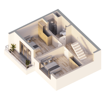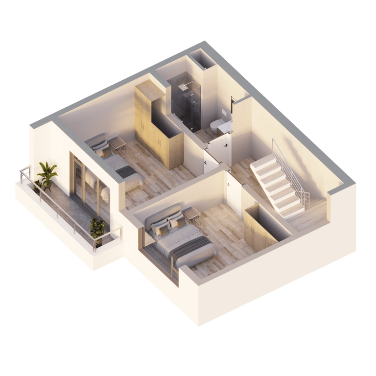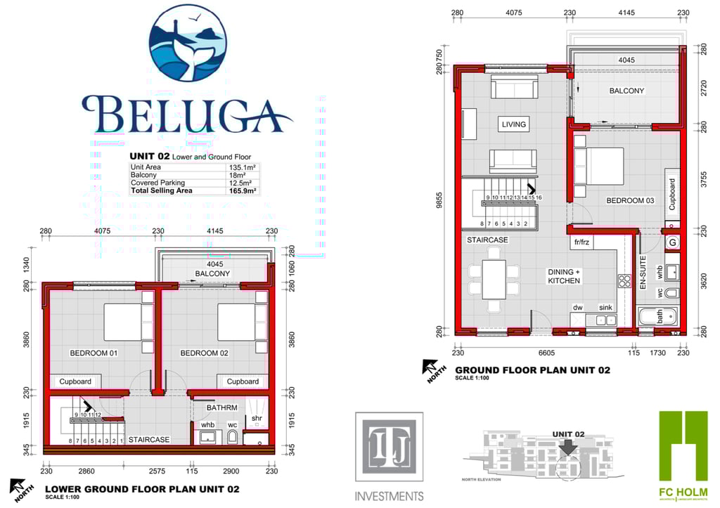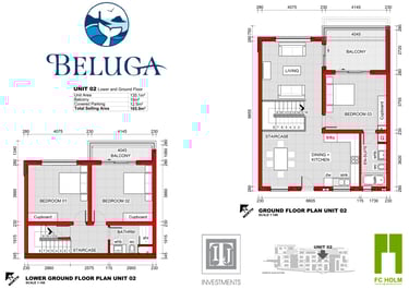Unit 02 presents a well-balanced two-storey layout that combines comfort, space and modern functionality. The lower-ground level features two generously sized bedrooms, each fitted with built-in cupboards, as well as a neatly designed bathroom with a shower, WC and washbasin. An internal staircase leads to an open-plan living and dining area on the ground floor, offering an inviting flow ideal for relaxation and entertaining. Large sliding doors extend the living space onto an 18 m² private balcony, creating a bright, airy connection between indoor and outdoor living. With a total selling area of 165.9 m², including covered parking, this unit provides a practical yet contemporary home suitable for a range of lifestyles.