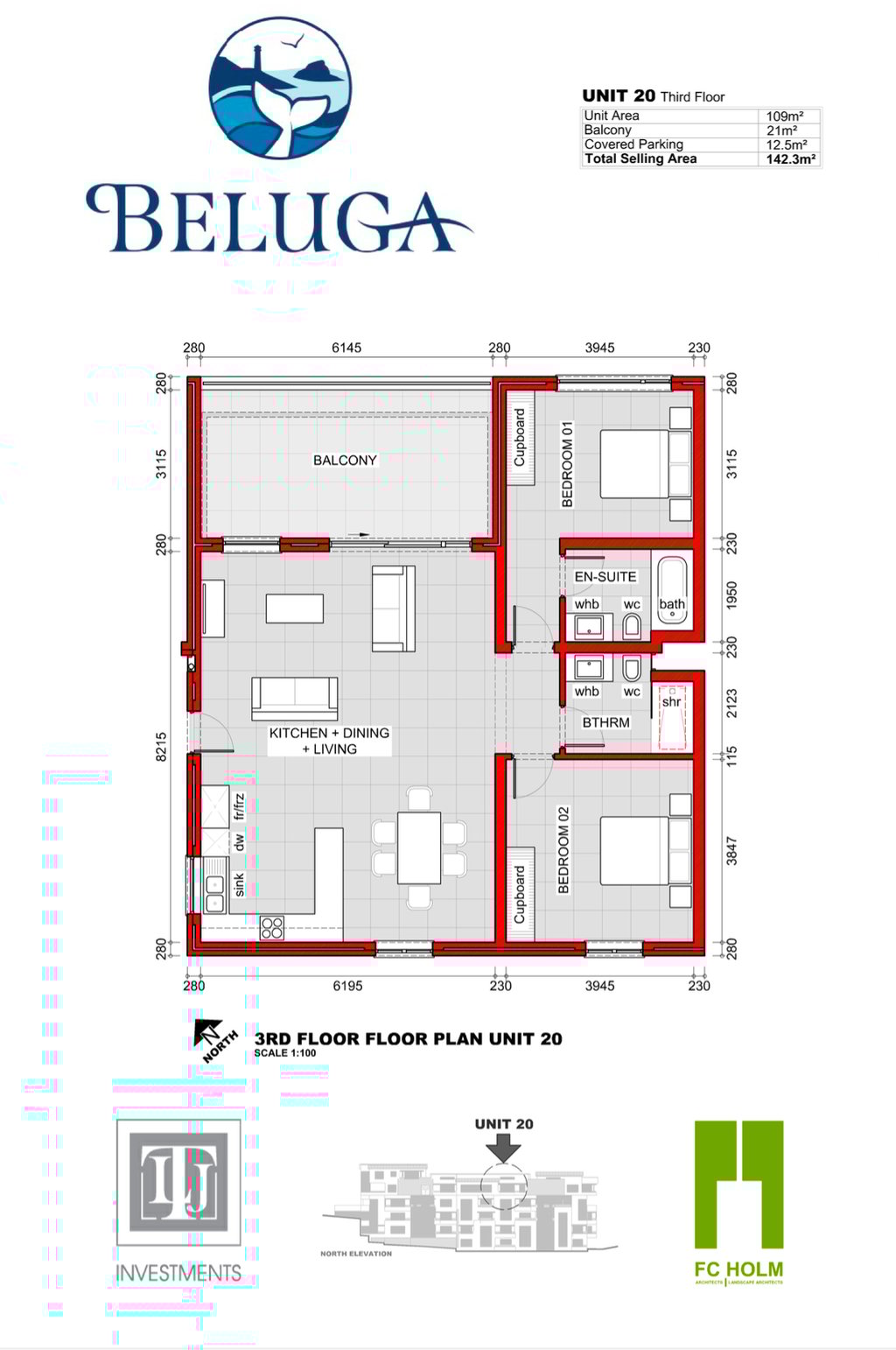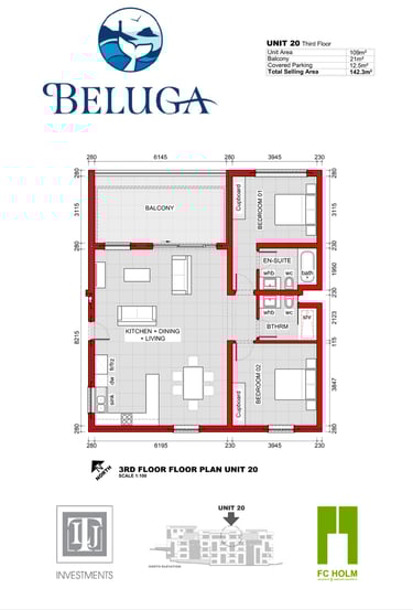 Unit 20 offers an expansive and luxurious third-floor layout with exceptional space, modern finishes and elevated living. The open-plan kitchen, dining and living area stretches generously across the unit, creating an impressive central hub ideal for entertaining or relaxed everyday living. Large sliding doors lead out to a substantial 21 m² balcony, providing ample outdoor space and excellent natural light throughout. The unit includes two spacious bedrooms, both fitted with built-in cupboards. The main bedroom features a private en-suite bathroom with a bath, WC and basin, while a second full bathroom—equipped with a shower, WC and basin—serves the rest of the home. With a total selling area of 142.3 m², including covered parking, Unit 20 stands out as one of the most spacious offerings in the development, ideal for those seeking comfort, style and generous living areas.