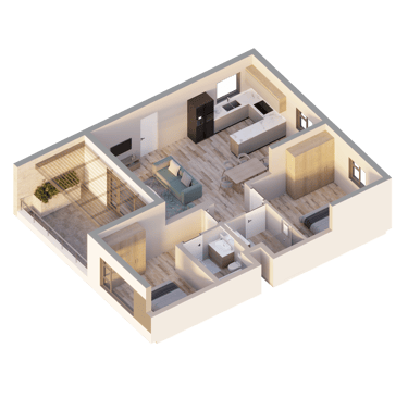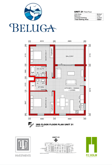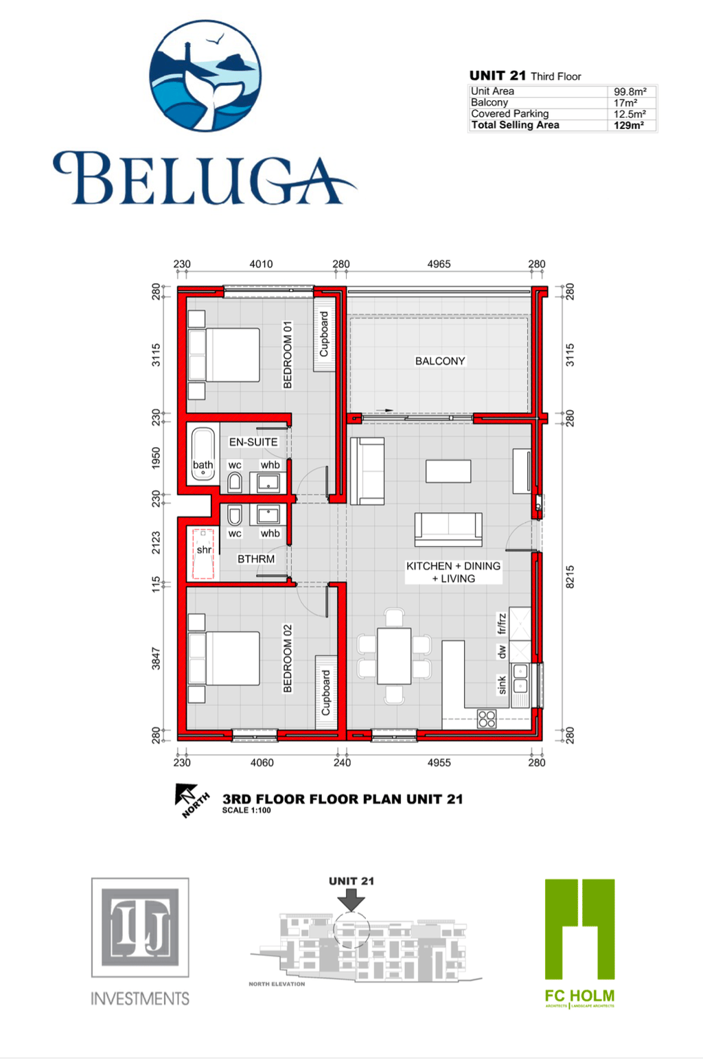 Unit 21 offers a spacious third-floor layout that combines modern comfort with generous proportions and excellent natural light. The open-plan kitchen, dining and living area forms a welcoming central space, flowing seamlessly onto a large 17 m² balcony—perfect for outdoor dining, relaxation or simply enjoying elevated views. The unit includes two well-sized bedrooms, both fitted with built-in cupboards. The main bedroom features a private en-suite bathroom with a bath, WC and basin, while a second full bathroom with a shower, WC and basin serves the remainder of the home. With a total selling area of 129 m², including covered parking, Unit 21 provides an elevated and contemporary living experience with superb indoor–outdoor integration.