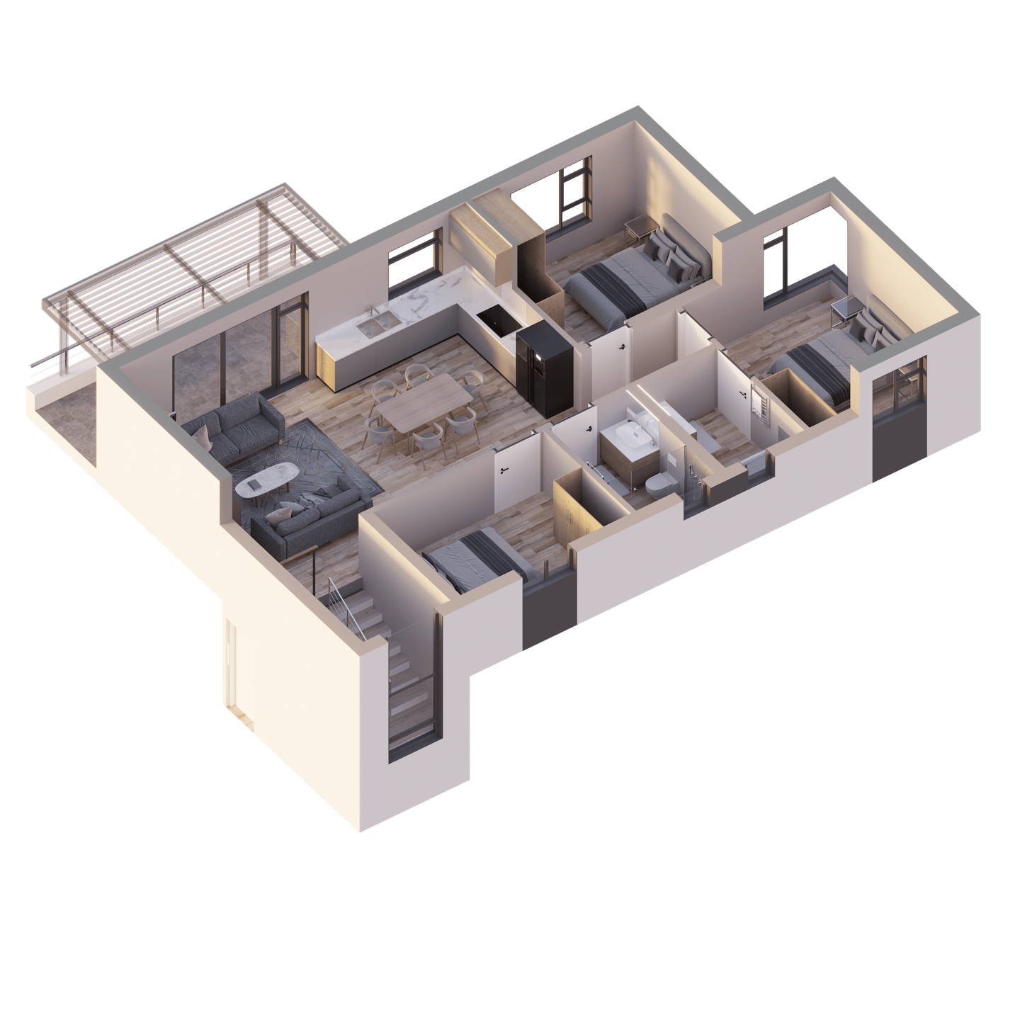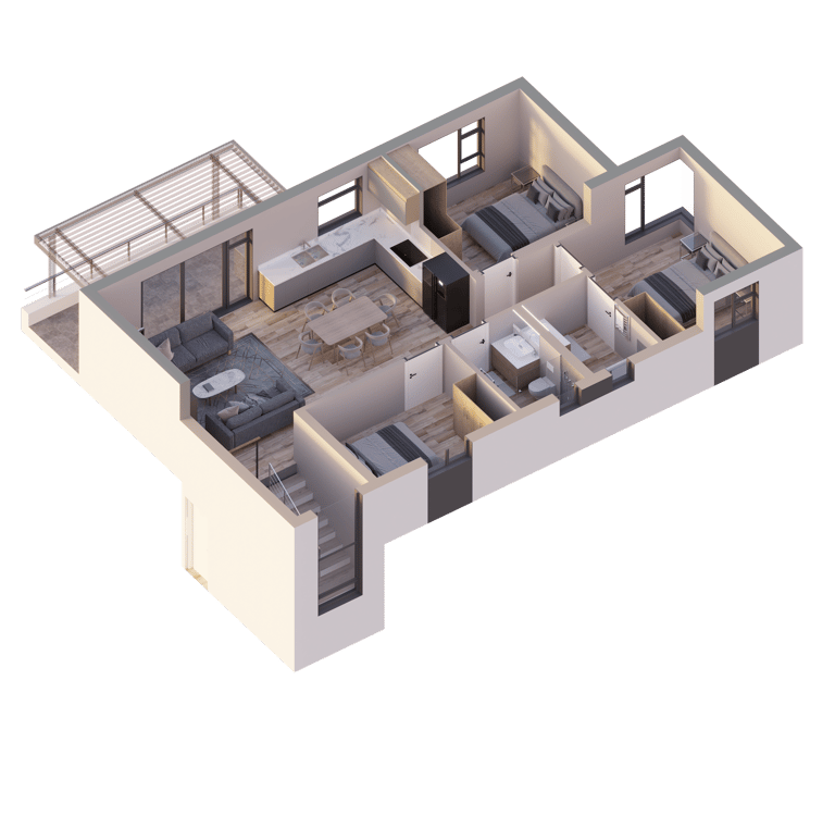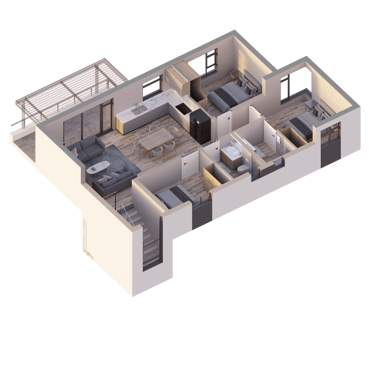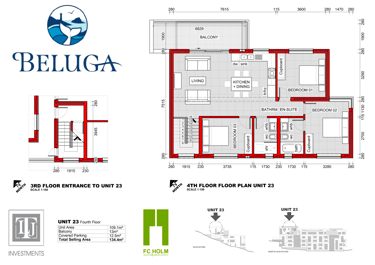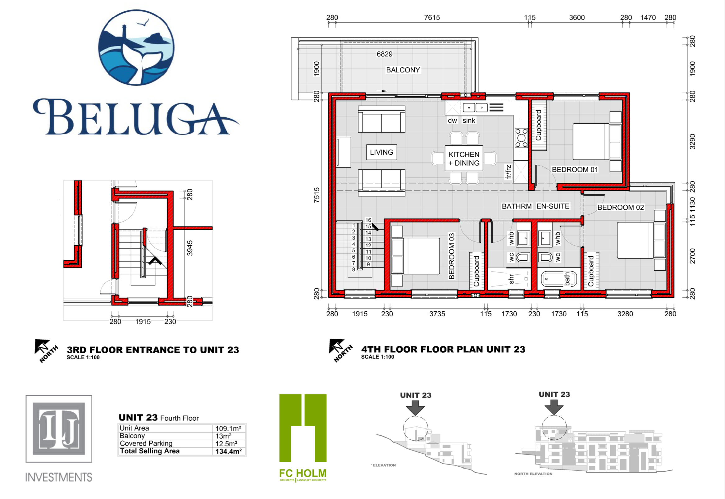 Unit 23 offers a premium fourth-floor layout with exceptional space, privacy and elevated views. Accessed via a private third-floor entrance with an internal staircase, the unit opens into an expansive open-plan kitchen, dining and living area that flows seamlessly toward a generous 13 m² balcony—ideal for outdoor entertaining, relaxing or enjoying panoramic light. This unit features three well-sized bedrooms, each fitted with built-in cupboards. The main bedroom includes a private en-suite bathroom with a bath, WC and basin, while a second full bathroom—equipped with a shower, WC and basin—conveniently serves the remaining bedrooms and living areas. With a total selling area of 134.4 m², including covered parking, Unit 23 stands out as one of the most spacious and exclusive residences in the development, perfectly suited to those seeking comfort, space and an elevated living experience.