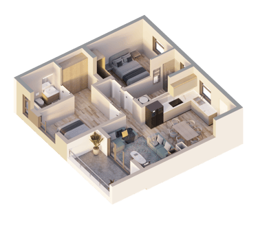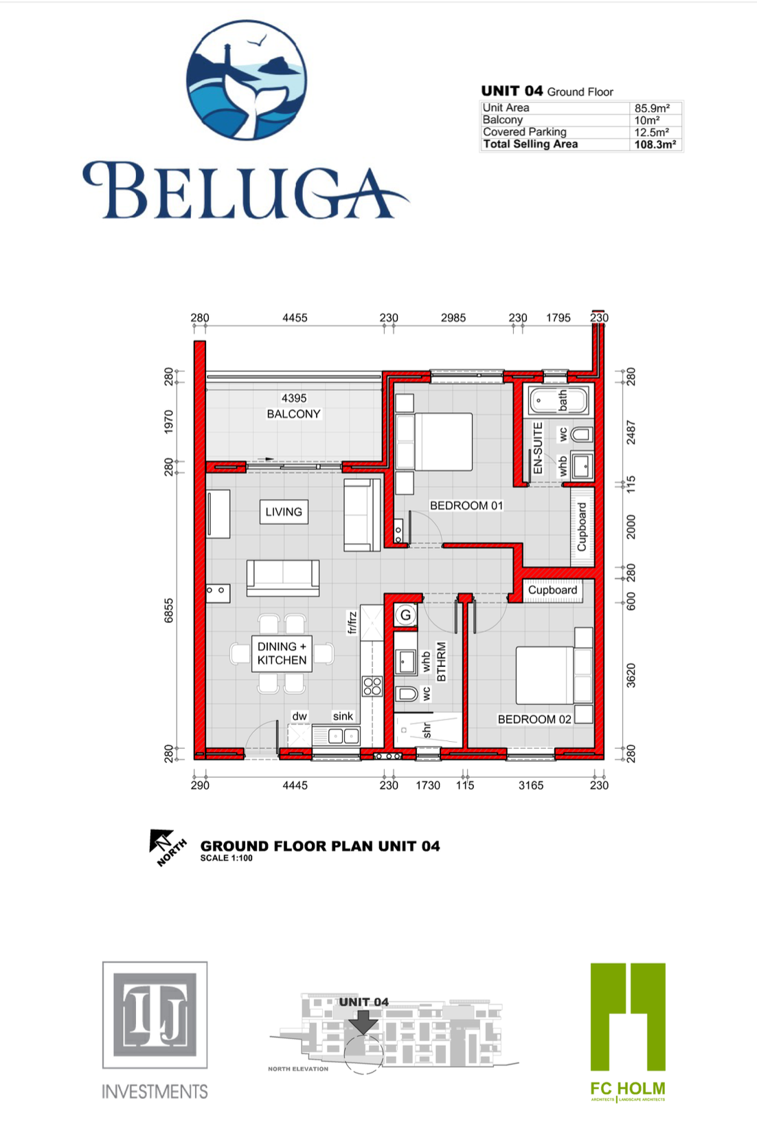 Unit 04 offers a well-proportioned single-level layout that blends practicality with modern comfort. The open-plan dining and kitchen area flows seamlessly into a bright living space, creating an inviting central hub for everyday living. Sliding doors open onto a generous 10 m² balcony, extending the indoor space and allowing natural light to fill the home. The unit includes two spacious bedrooms, each fitted with built-in cupboards. The main bedroom features a private en-suite bathroom, while a second full bathroom serves the rest of the home. With a total selling area of 108.3 m², including covered parking, Unit 04 delivers a streamlined and highly functional design ideal for comfortable, contemporary living.