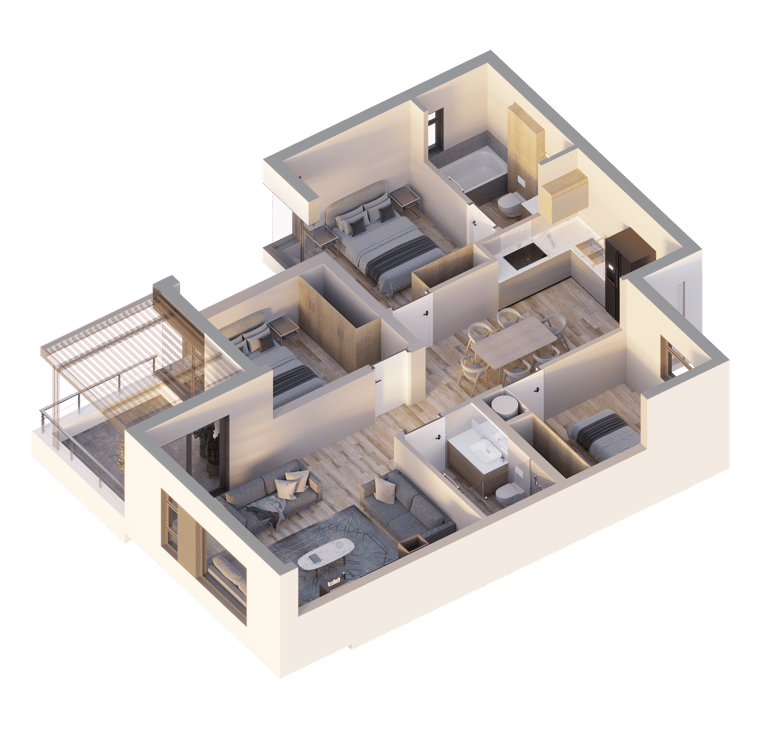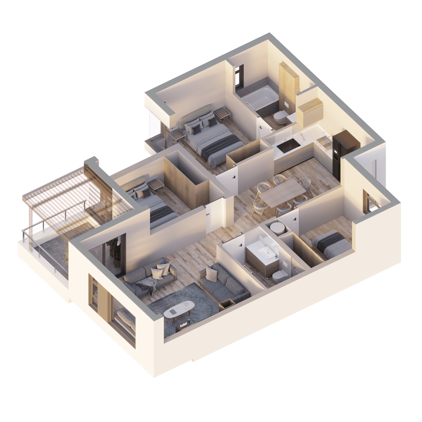 Unit 05 presents a spacious and well-organised ground-floor layout ideal for modern family living. The heart of the home is the open-plan dining and kitchen area, flowing naturally into a bright and generously sized living room. Large sliding doors open onto a 10 m² balcony, creating a seamless indoor–outdoor connection. This unit offers three comfortable bedrooms, each with built-in cupboards. The main bedroom includes a private en-suite bathroom, while a second full bathroom serves the remainder of the home. With a total selling area of 125.7 m², including covered parking, Unit 05 combines functionality, generous proportions and welcoming contemporary design.