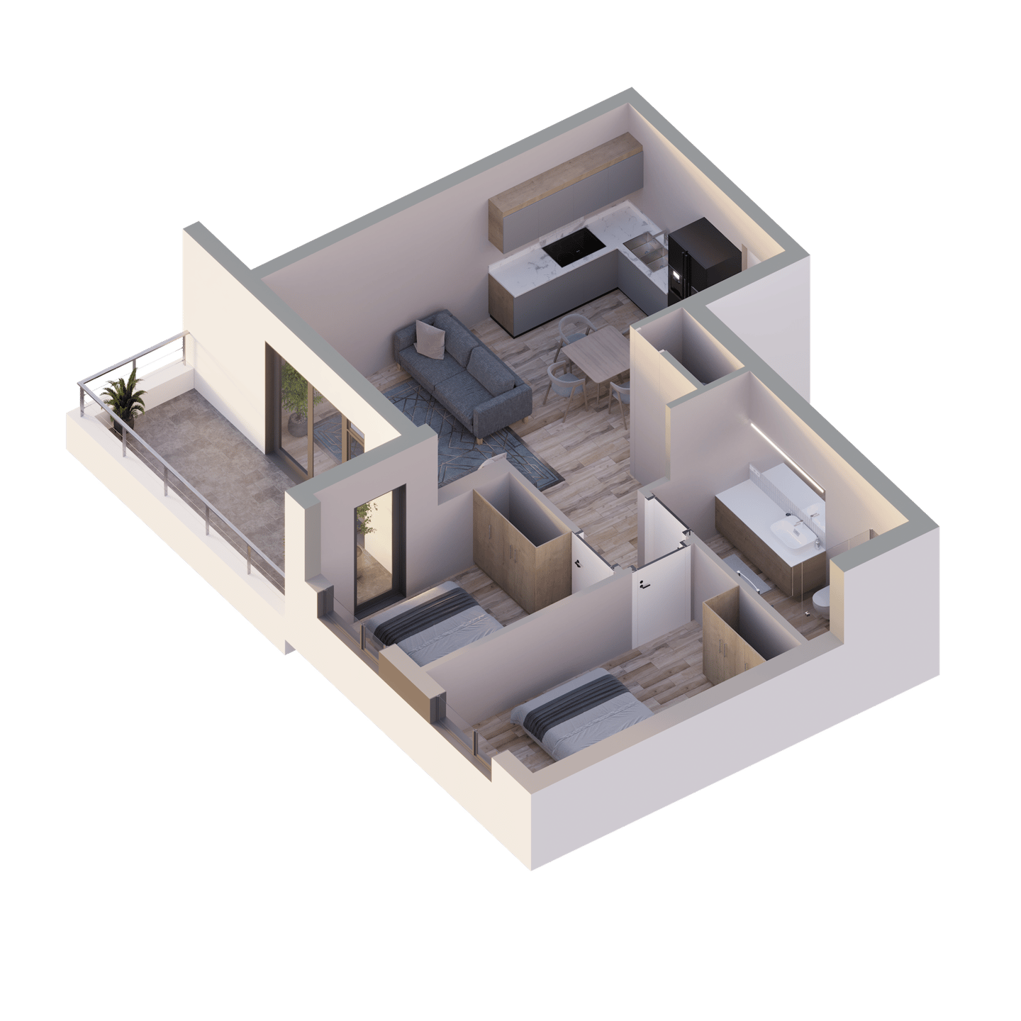 Unit 06 offers a thoughtfully designed ground-floor layout ideal for modern, efficient living. The open-plan living, dining and kitchen area forms the central hub of the home, with a practical kitchen layout and a comfortable living space that opens directly onto an 11 m² balcony—perfect for fresh air and natural light. The unit includes two well-sized bedrooms, each with built-in cupboards, and a neatly arranged bathroom featuring a shower, WC and basin. With a total selling area of 89.7 m², including covered parking, Unit 06 combines functionality with a bright, compact and contemporary design.