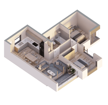 Unit 08 offers a well-designed first-floor layout with a bright and welcoming atmosphere. The open-plan dining, kitchen and living area forms a generous central space, with sliding doors opening onto a 6 m² balcony that brings in natural light and provides an airy outdoor extension. The unit includes two comfortable bedrooms, both fitted with built-in cupboards, and a neatly arranged bathroom featuring a bath, shower, WC and basin. With a total selling area of 92.1 m², including covered parking, Unit 08 delivers a practical, modern living experience with excellent flow and efficient use of space.